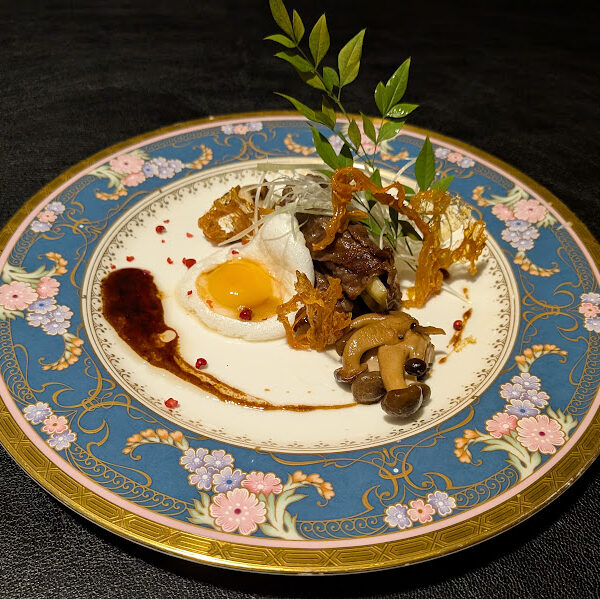 黒毛和牛 肩ロースのすき焼き風 返しで煮込まれた牛肉、その中に巻き込まれた白ネギ。 返しに漬け込んだ鶉の卵黄と泡立てて蒸しあげた卵白。人参と生姜の飴で構成された一皿。 別々に調理された食材を食べ進めると、口の中ですき焼きの味に変化していく。